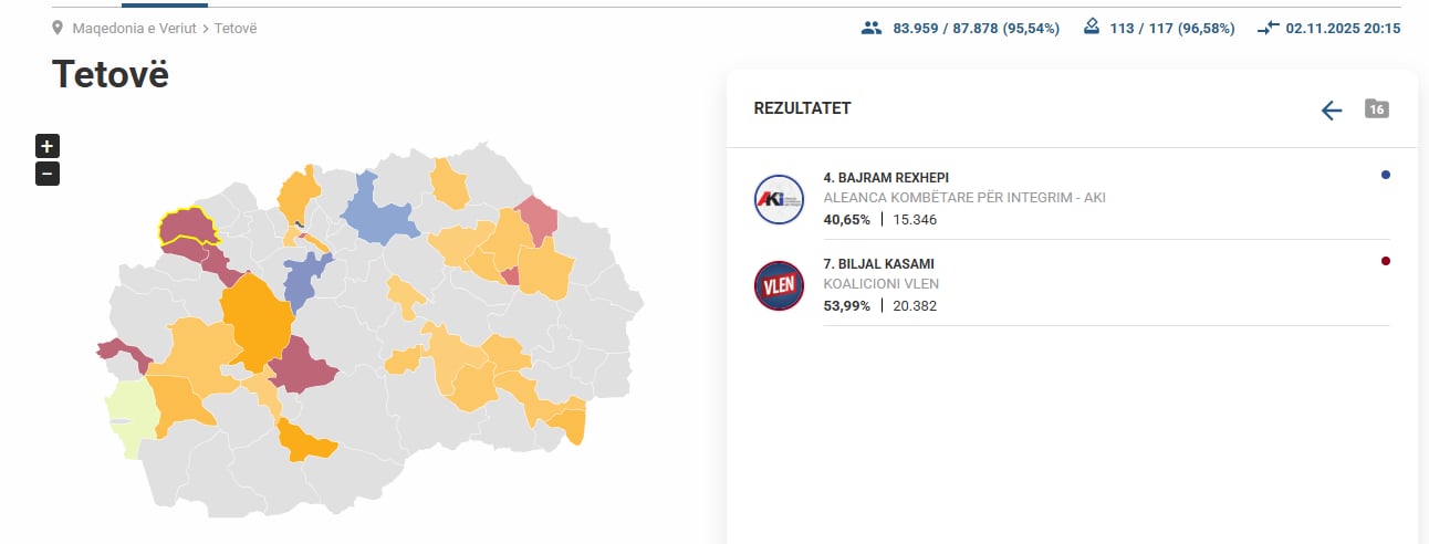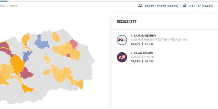 Sipas rezultateve të fundit të publikuara nga Komisioni Shtetëror i Zgjedhjeve për raundin e dytë të zgjedhjeve lokale në komunën e Tetovës, kandidati i koalicionit VLEN, Bilall Kasami, është në epërsi me 53,99% të votave, ose 20.382 vota të numëruara deri tani.