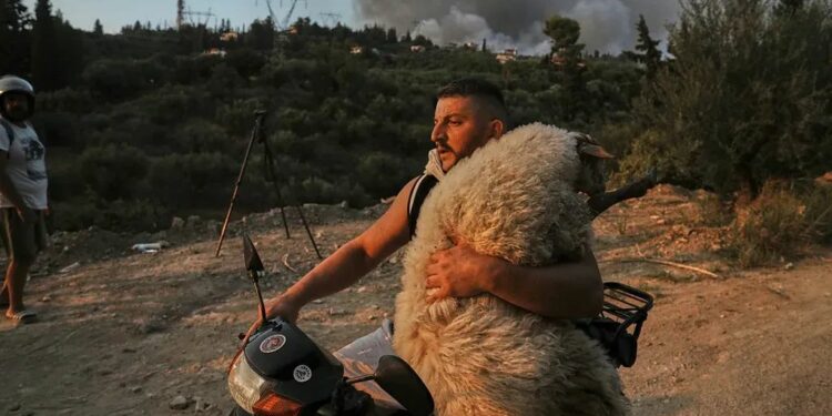 Fotografia, e realizuar nga Thanassis Stavrakis, fotoreporter bashkëpunëtor i agjencisë Reuters, tregon një burrë shqiptar teksa shpëton një dele nga flakët në zonën e Patrës, duke e mbajtur me vete mbi motor nëpër tym dhe zjarr, shkruan Euronews.al, transmeton Klankosova.tv.