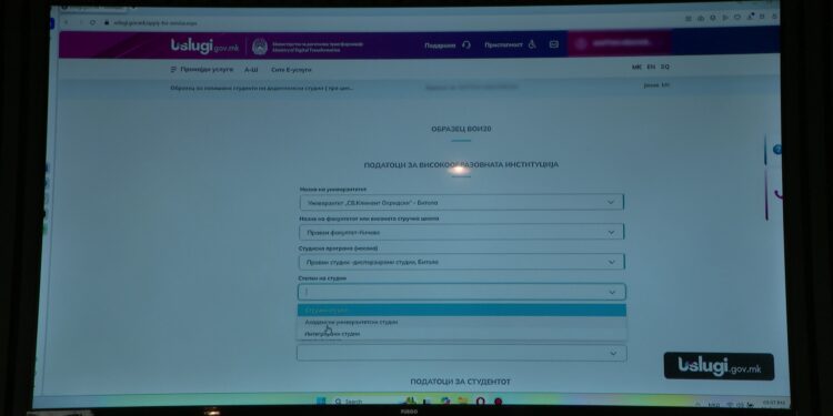 Studentët e ciklit të parë të studimeve kanë mundësinë të plotësojnë online formularin për regjistrimin e semestrit. Formulari është i disponueshëm në Portalin Kombëtar për e-shërbime www.uslugi.gov.mk. Me këtë mjet digjital, studentët dhe universitetet kursejnë kohë dhe shpenzime, ndërsa Instituti Shtetëror i Statistikave merr të dhëna të sakta dhe të përditësuara statistike nga fusha e arsimit të lartë.