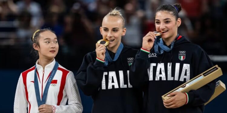 Sekuenca e imazheve është bërë virale në mediat sociale në të cilat shohim kinezen Yaqin Zhou, e argjendtë në rrezen e grave, duke vëzhguar me habi dhe më pas duke imituar italianet Alice D’Amato (ari) dhe Manila Esposito (bronz) që synojnë t’i kafshojnë medaljet. Por nga vjen ky gjest?