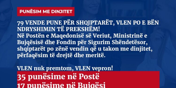 VLEN me kënaqësi njofton opinionin publik se janë realizuar 79 punësime të reja, si rezultat i angazhimit të palëkundur për përfaqësim të drejtë dhe dinjitoz të shqiptarëve në institucionet shtetërore. 35 punësime të përhershme në Postën e Maqedonisë së Veriut. 17 punësime në Ministrinë e Bujqësisë, Pylltarisë dhe Ekonomisë së Ujërave. 27 punësime në Fondin për Sigurim Shëndetësor